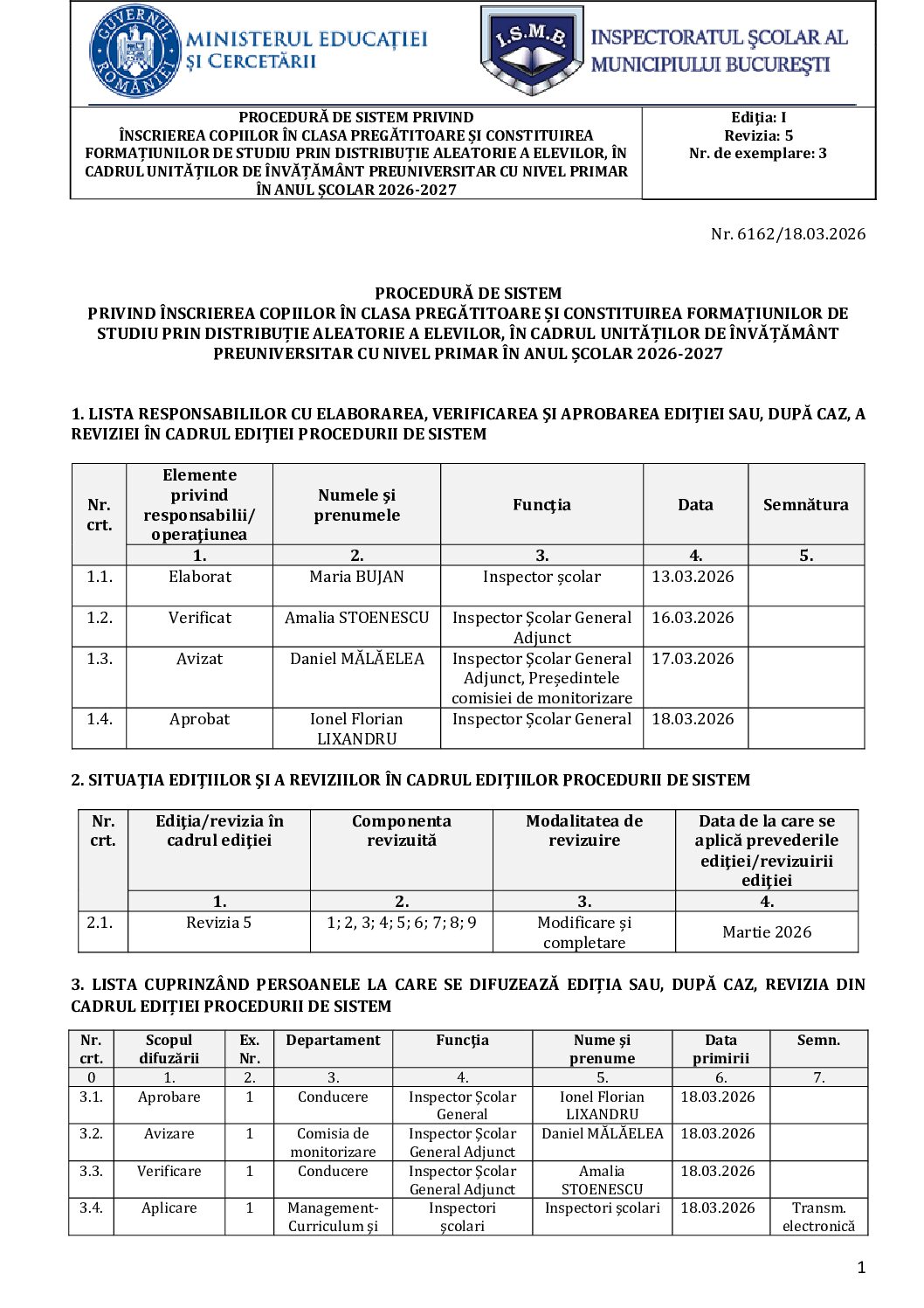 Procedura de sistem ISMB nr. 6162 din 18.03.2026 inscriere cls.preg si constituire formatiuni de studiu prin distributie aleatorie 2026-2027