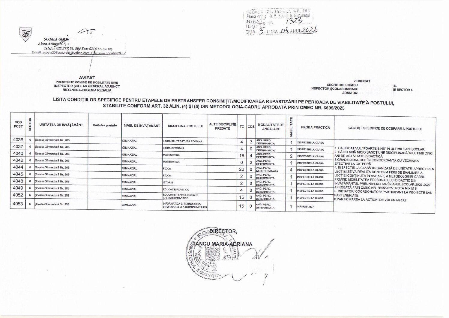 LISTA CONDIȚIILOR SPECIFICE PENTRU ETAPELE DE TRANSFER/PRETRANSFER CONSIMIȚIT/MODIFICAREA REPARTIZĂRII PE PERIOADA DE VIABILITATE A POSTULUI, STABILITE CONFORM ART. 32 ALIN. (4) ȘI (5) DIN METODOLOGIA-CADRU APROBATĂ PRIN OMEC NR. 6695/2025